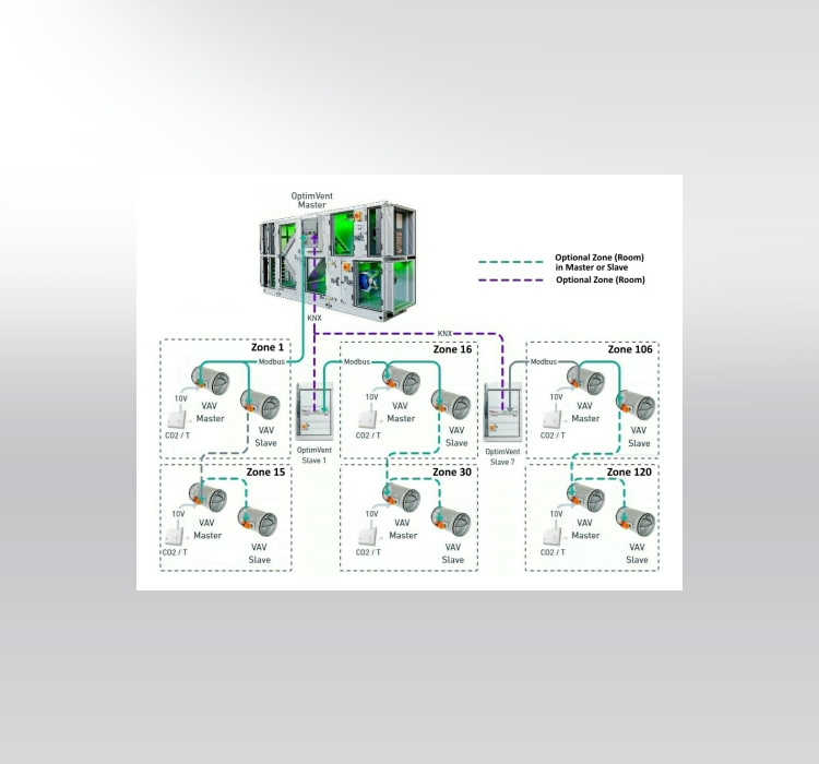 Optimalisatie van het opgenomen ventilator vermogen van de luchtbehandelingskast kan nauwkeurig geregeld worden bij toepassing van variabel volume regelaars, als het ventilator werkpunt aangepast wordt op basis van actuele data afkomstig van de variabel volume regelaars (VAV's). Als de luchtbehandelingskast actief samenwerkt met de VAV regelaars, ontstaat er een grote reductie van het energieverbruik van de ventilatoren wat uiteraard resulteert in een gunstig effect op de operationele kosten van het luchtbehandelingssysteem. Automatische ventilator regeling zorgt voor een optimale ratio tussen luchtvolume en het energieverbruik. De werking van het OptimVent systeem resulteert in een significante daling van het drukverlies in het VAV systeem en draagt naast de benodigde energiereductie ook zorg voor een daling van het geluidsniveau in de comfort zone(s).